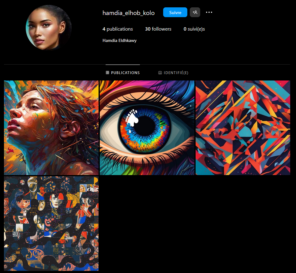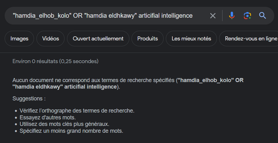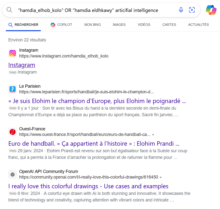 Nous avons donc à présent de nouvelles informations sur lesquelles pivoter. Rien d'intéressant dans les publications, rien non plus sur son profil mais nous avons maintenant un nom d'utilisateur "hamdia_elhob_kolo" ainsi qu'un potentiel centre d'intérêt: l'Intelligence Artificielle. Après avoir fouillé son compte de fond en comble (avec les sites d'archives notamment), nous revenons à nos recherches initiales avec le nouveau nom d'utilisateur. Après un passage sur https://whatsmyname.app/ qui n'est pas concluant, on revient à la technique originelle: les moteurs de recherche. On essaye de dork sur Google mais aucun résultat n'est trouvé, puis on essaye sur d'autres moteurs de recherche comme Bing.