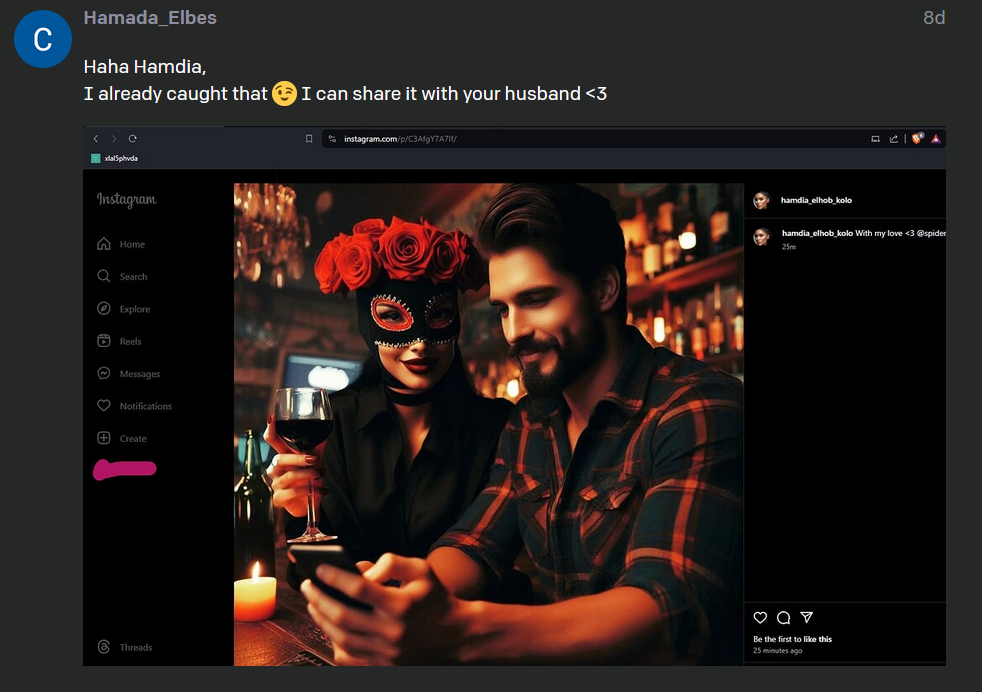 On y apprend qu'un certain "Hamada Elbes" est au courant des relations de Hamdia et qu'il a récupéré un post de Hamdia (post qui n'existe plus) dans lequelle elle partage de bons moments avec son amant, qu'elle mentionne dans son post mais dont nous n'avons qu'une partie du pseudo.
