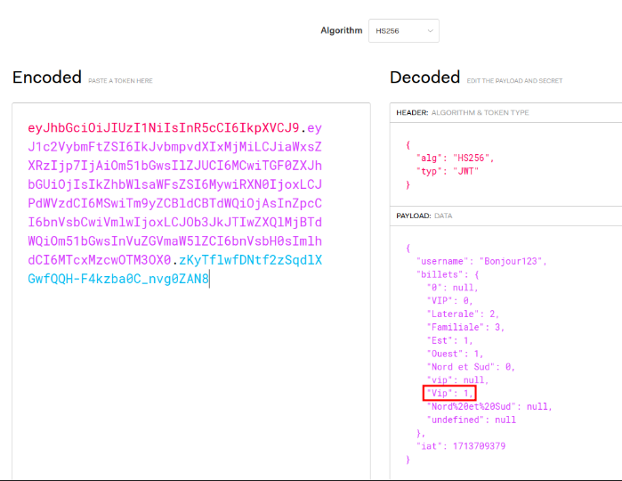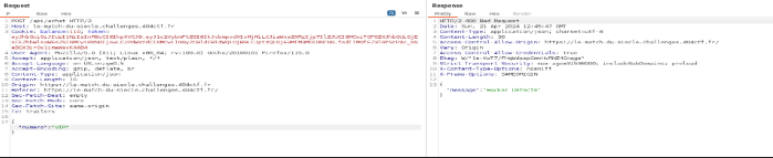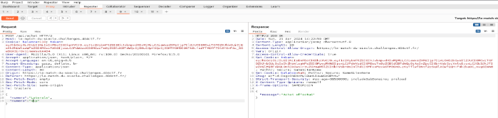 Apres avoir touver le premier flag, il faut maintenant prendre un ticket VIP, pour se faire j ai interceoter la requete avec burp. Si nous ajoutons directment un ticket VIP, il y a un message d erreur car ils ne sont plus disponible: