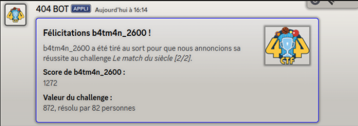 A la resolution de ce challenge, mon pseudo a etait affiche dans le discord de 404ctf :