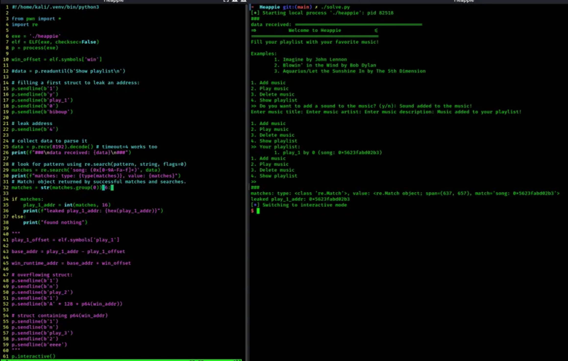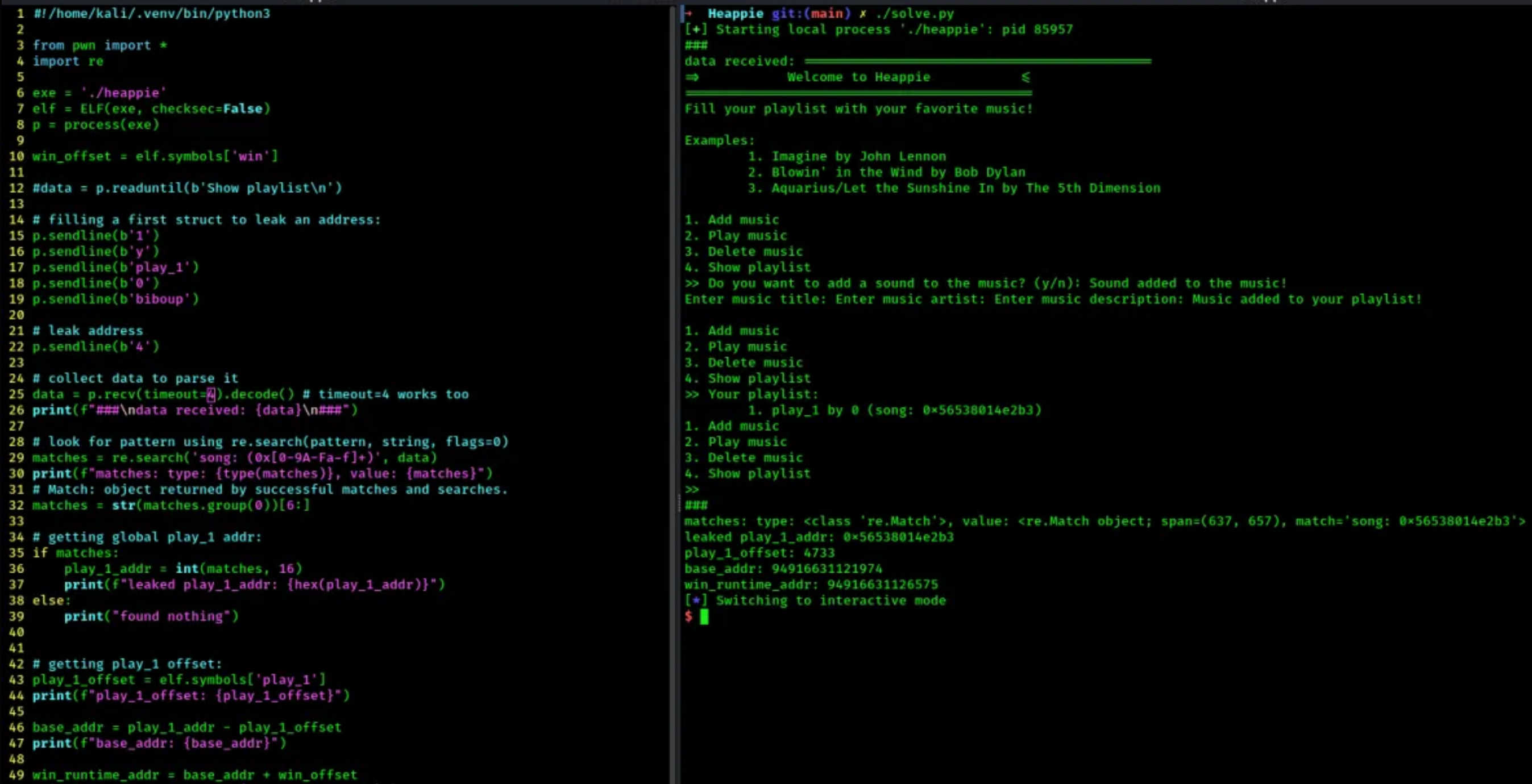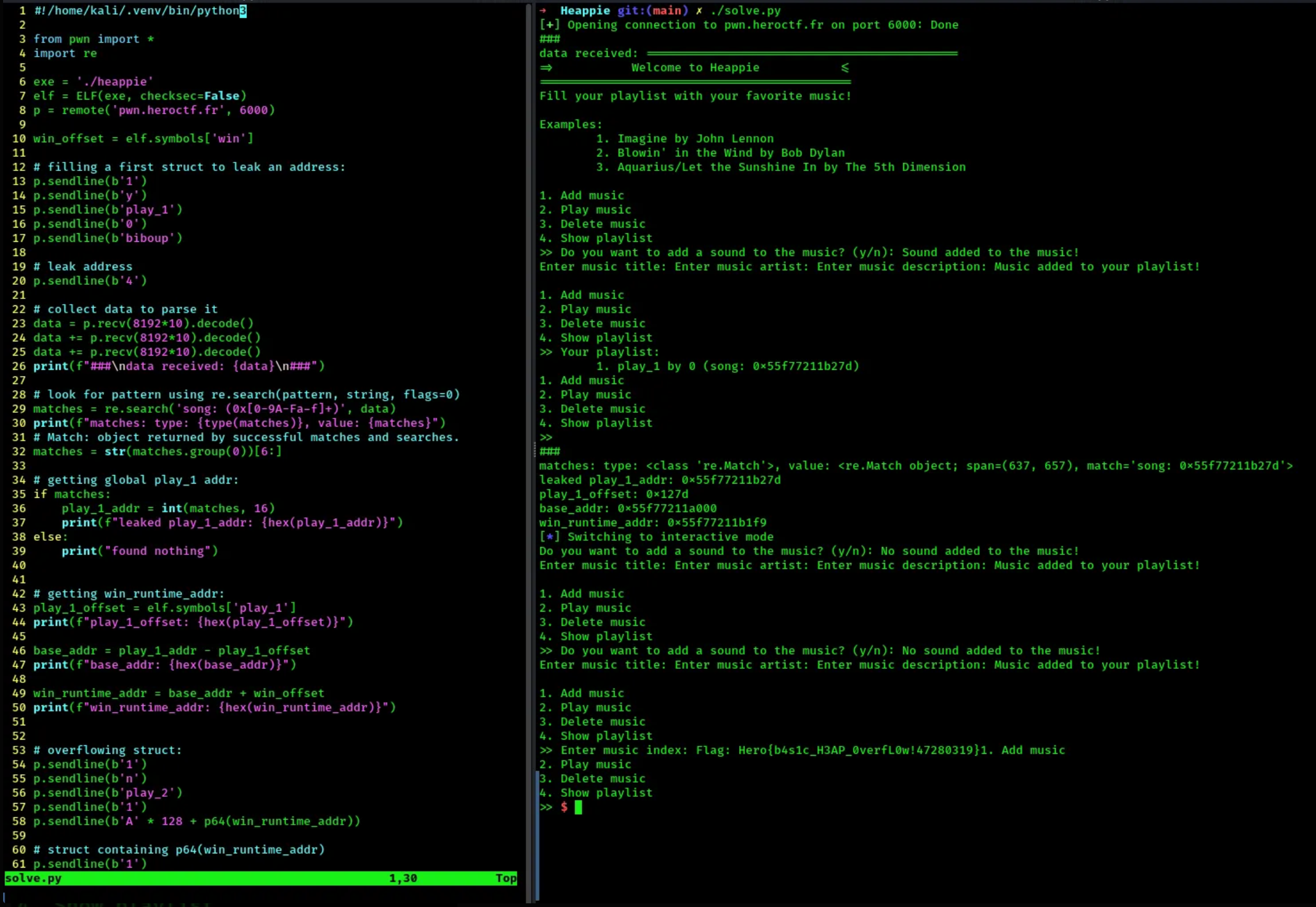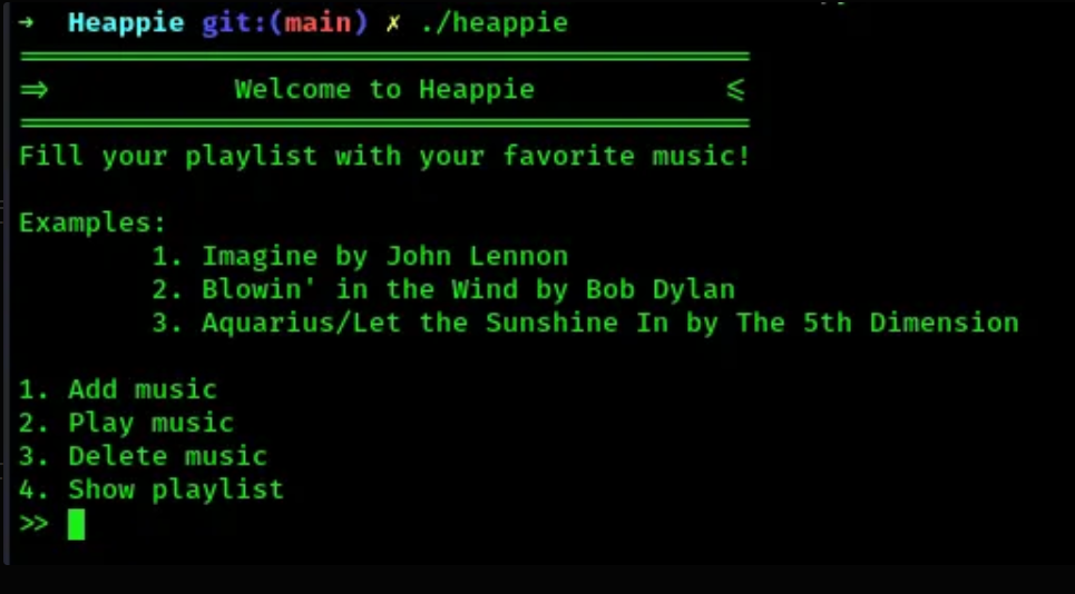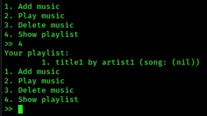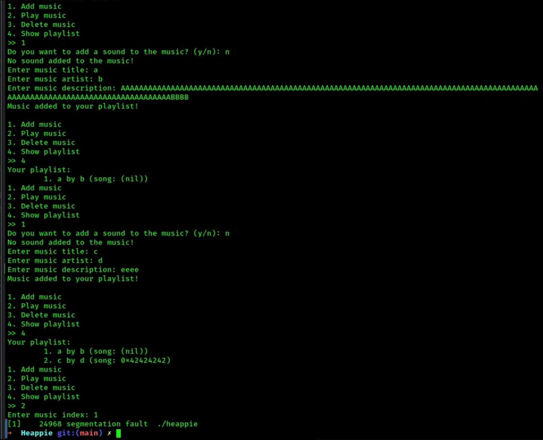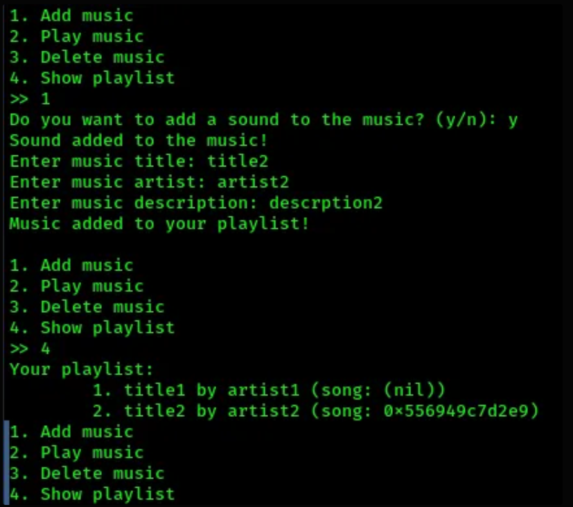 Heappie is a simple application that allows you to save and play your favorite songs. Find a way to exploit it and read the flag.