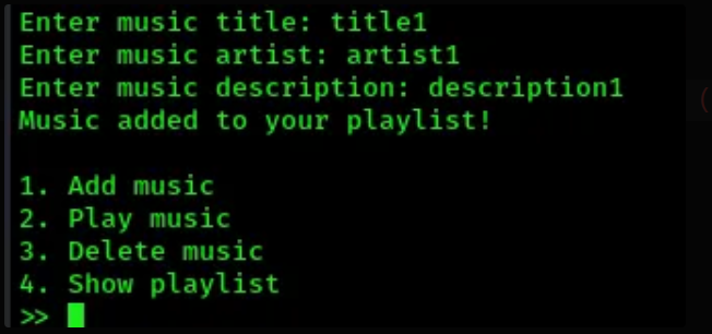 scanf("%s", music->description);montre quescanfest utilisé pour écrire l’entrée utilisateur dans l’élémentdescriptiond’une structuremusic(music->description), sans aucune vérification de taille. On peut donc y mettre un texte aussi long qu’on le souhaite… et potentiellement déborder de la mémoire qu’on pourra exploiter.