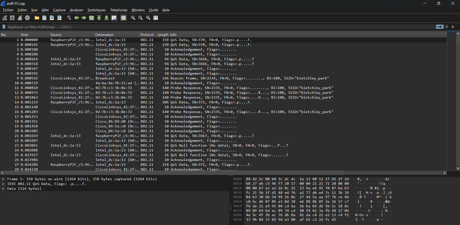 Ce challenge est étrangement mis dans la catégorie MISC alors qu'il aurait complètement sa place dans la catégorie Forensic, mais peut importe. Nous avons une analyse réseau. En ouvrant le fichier avec Wireshark, on découvre que c'est une communication WiFi entre un appareil et un point d'accès dont le nom de réseau est "bletchley_park". Nous ne pouvons pas voir ce qui transite car la communication est chiffrée, et nous avons besoin du mot de passe (ainsi que du nom du réseau) afin de le déchiffrer.