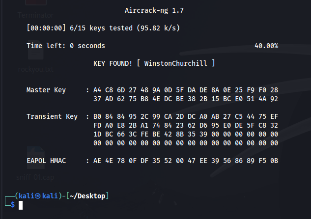 Comme dans la communication nous avons aussi la capture de l'authentification de l'appareil sur le réseau, nous pouvons bruteforcer le mot de passe avec Aircrack-ng et la wordlist "rockyou":