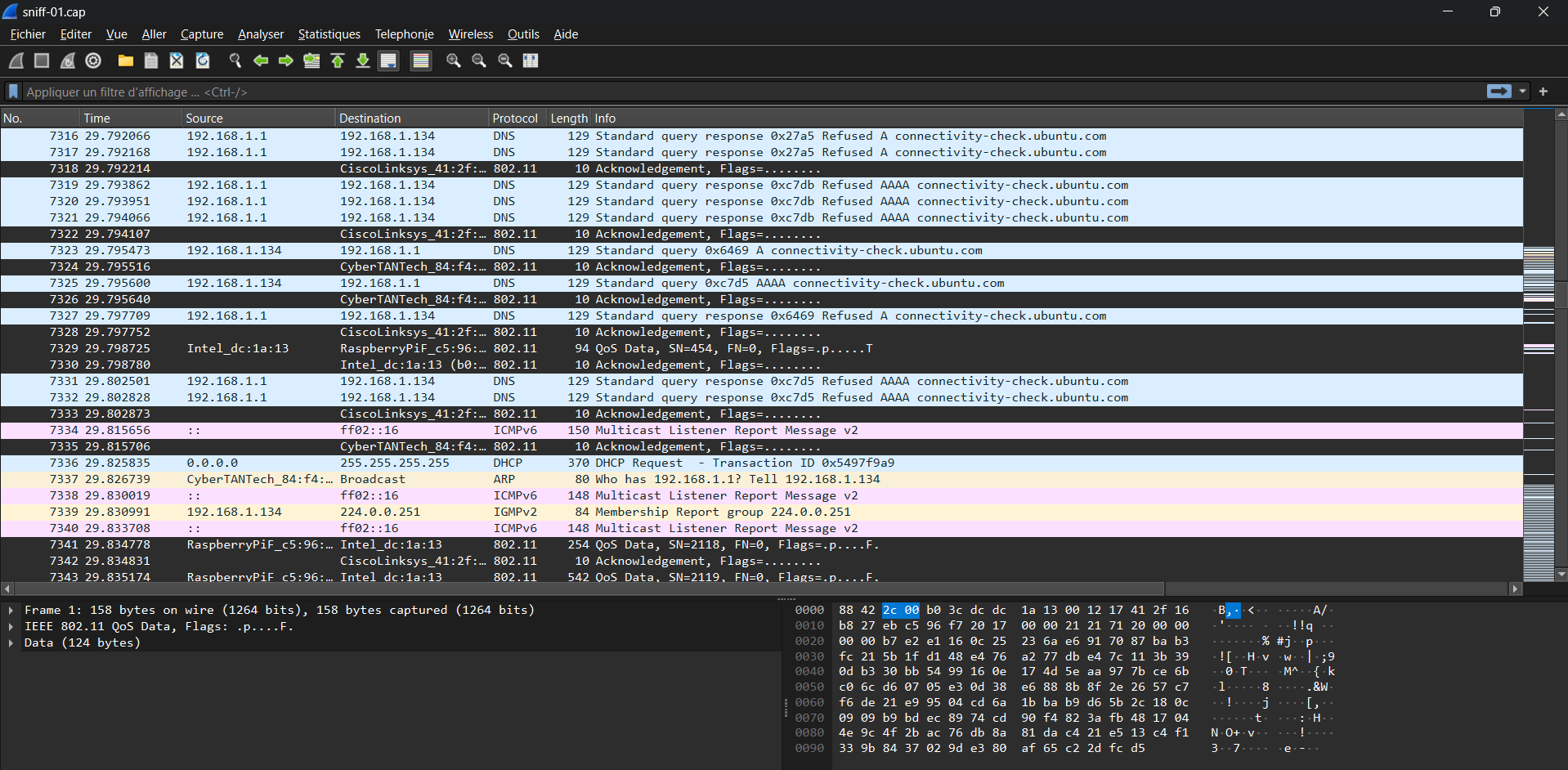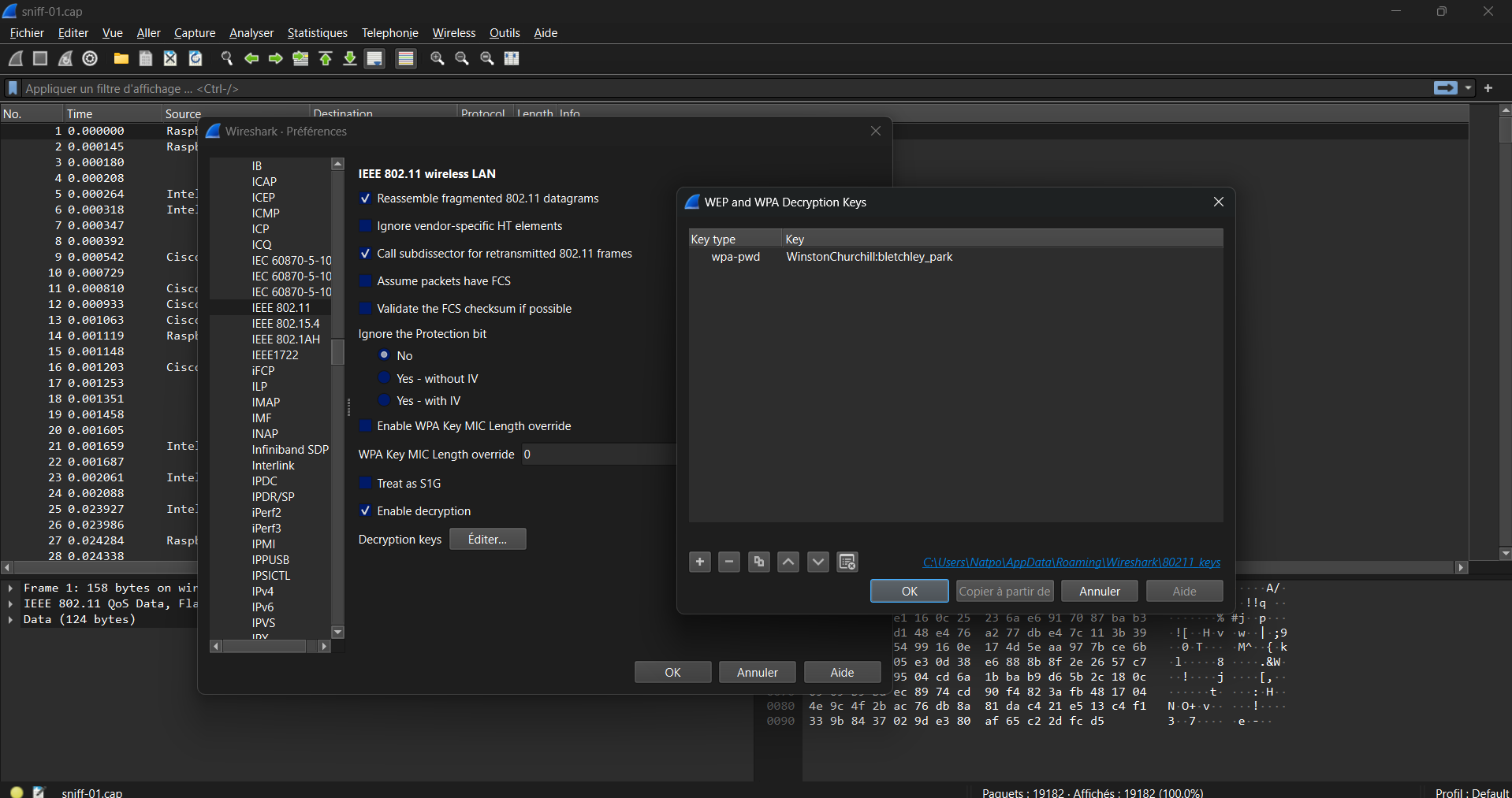 Maintenant que l'on possède le mot de passe, on peut déchiffrer la communication en allant dans "Editer" puis "Préférences" puis "Protocols" puis "IEEE 802.11" puis "éditer les clés de déchiffrement" et ensuite on entre le SSID et le mot de passe: