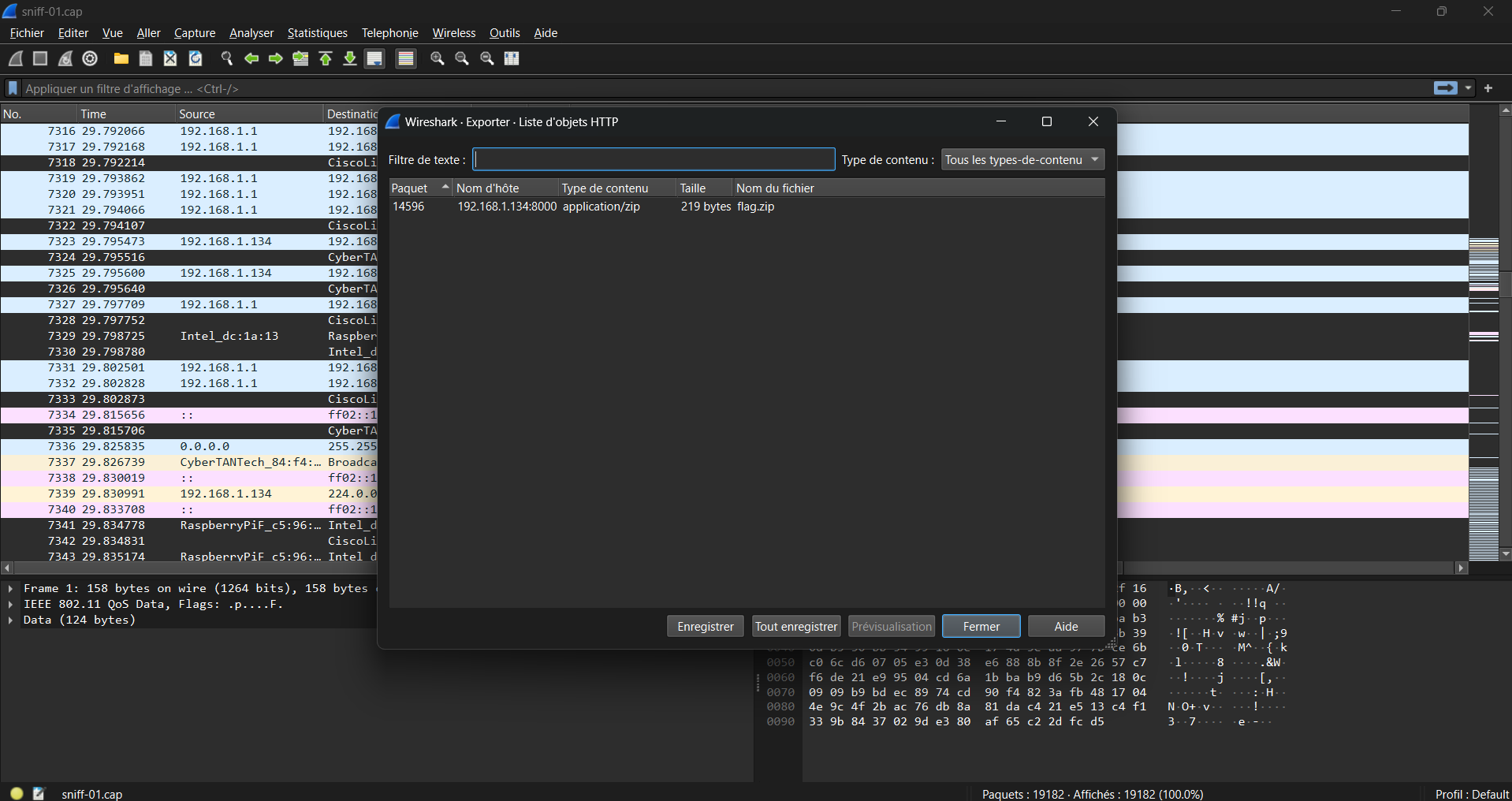 Comme la communication est grosse, c'est compliqué de voir tout ce qui passe rapidement, mais on peut utiliser la fonction "Exporter Objets" de Wireshark, qui permet de télécharger les éléments qui ont transité dans la capture sous certains protocoles bien précis comme le HTTP ou le SMB, et, en l'occurence, il y a une requête HTTP qui contient un fichier ZIP qui risque de nous intéresser: