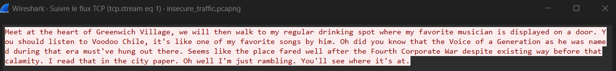 C'est très rare d'avoir une analyse réseau lors d'un challenge d'OSINT, la première partie va donc consister à trouver le message dont il est question afin de pouvoir basculer sur la partie recherche OSINT. Ici, la fonction "suivre le flux TCP" de l'outil Wireshark (outil d'analyse réseau par excellence) est suffisante pour afficher le message.
