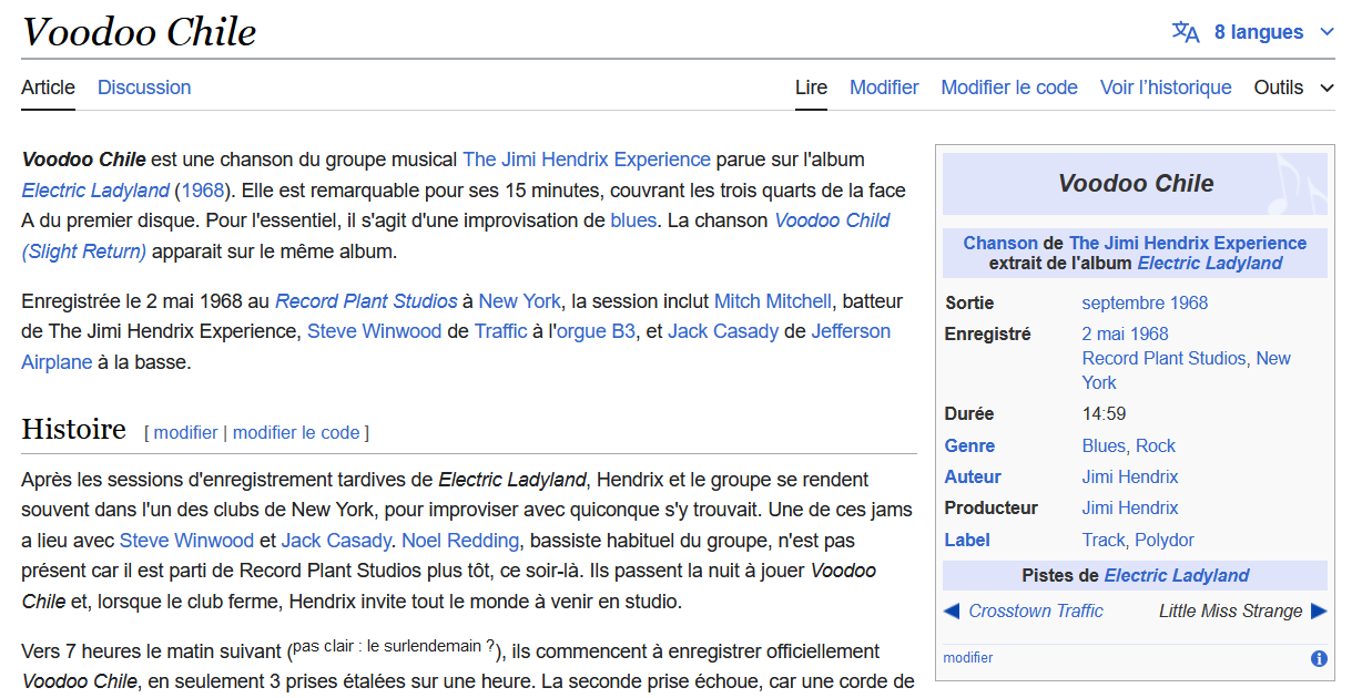 Nous commençons donc par rechercher le musicien qui serait l'auteur du son "Voodoo Chile". Ici une simple recherche Google nous amène sur la page Wikipédia du son qui nous donne la réponse: