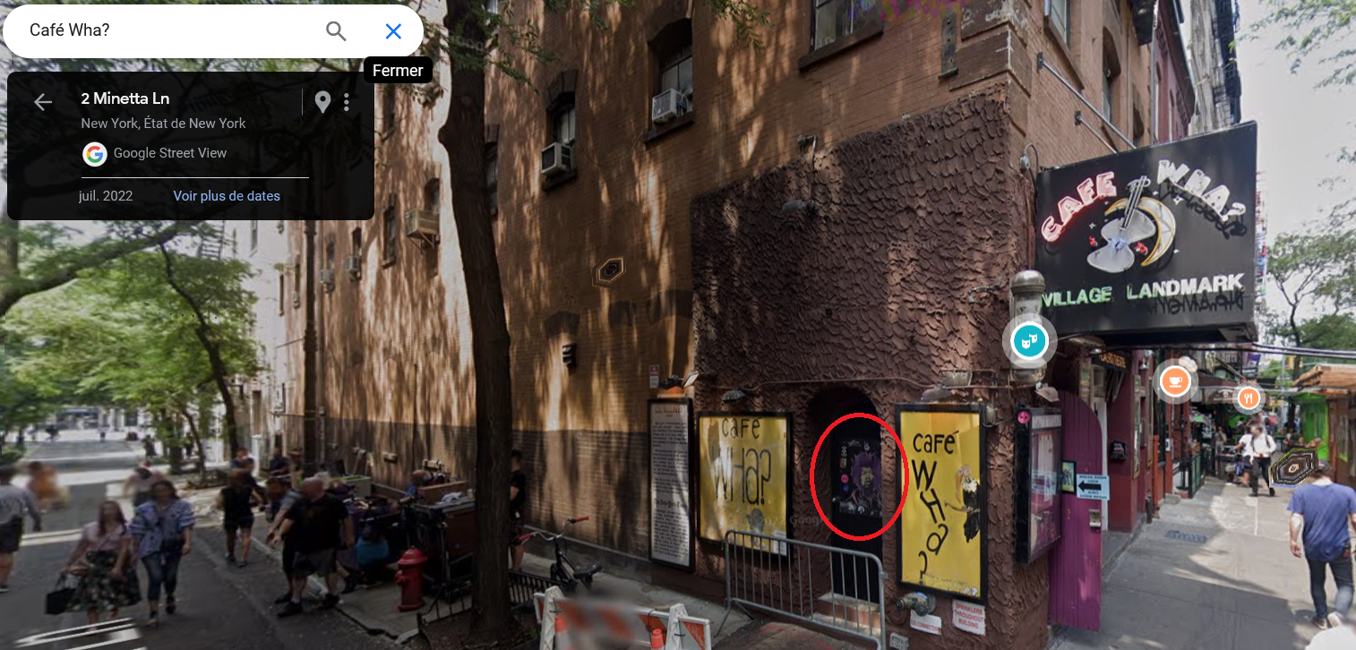 Nous avons 3 possibilités, mais par chance ma culture personnelle m'a permis de trouver sans hésitation le bon, qui est le "Café Wha?", mais nous allons quand même confirmer cela avec Google Street View: