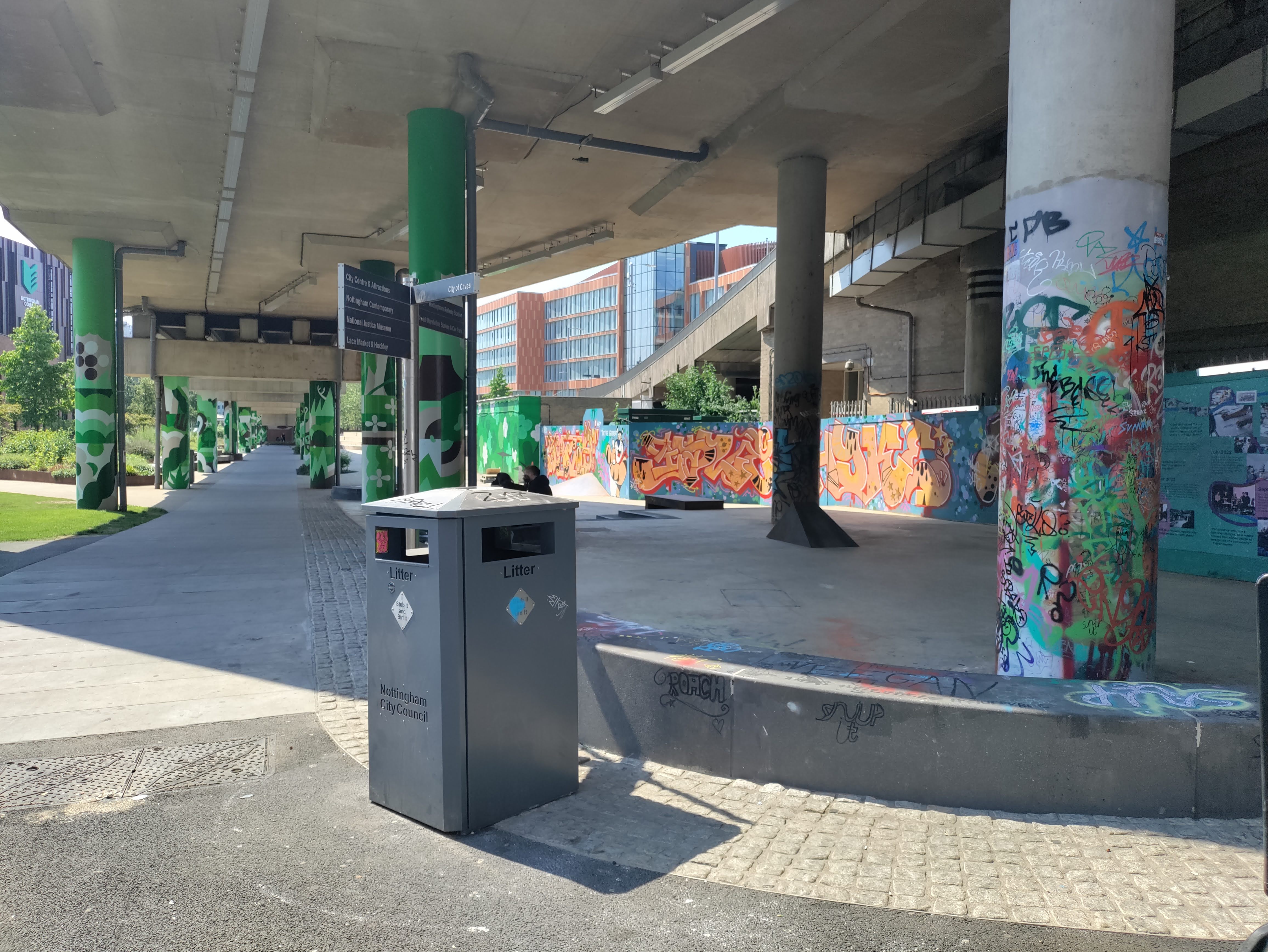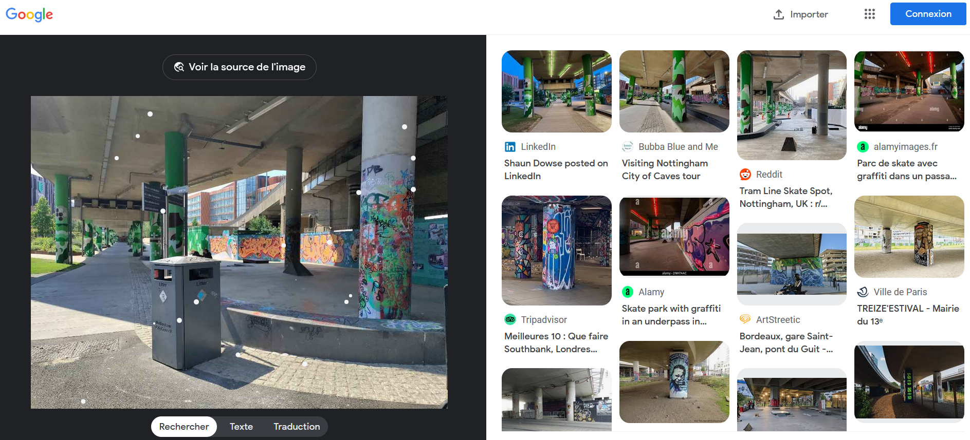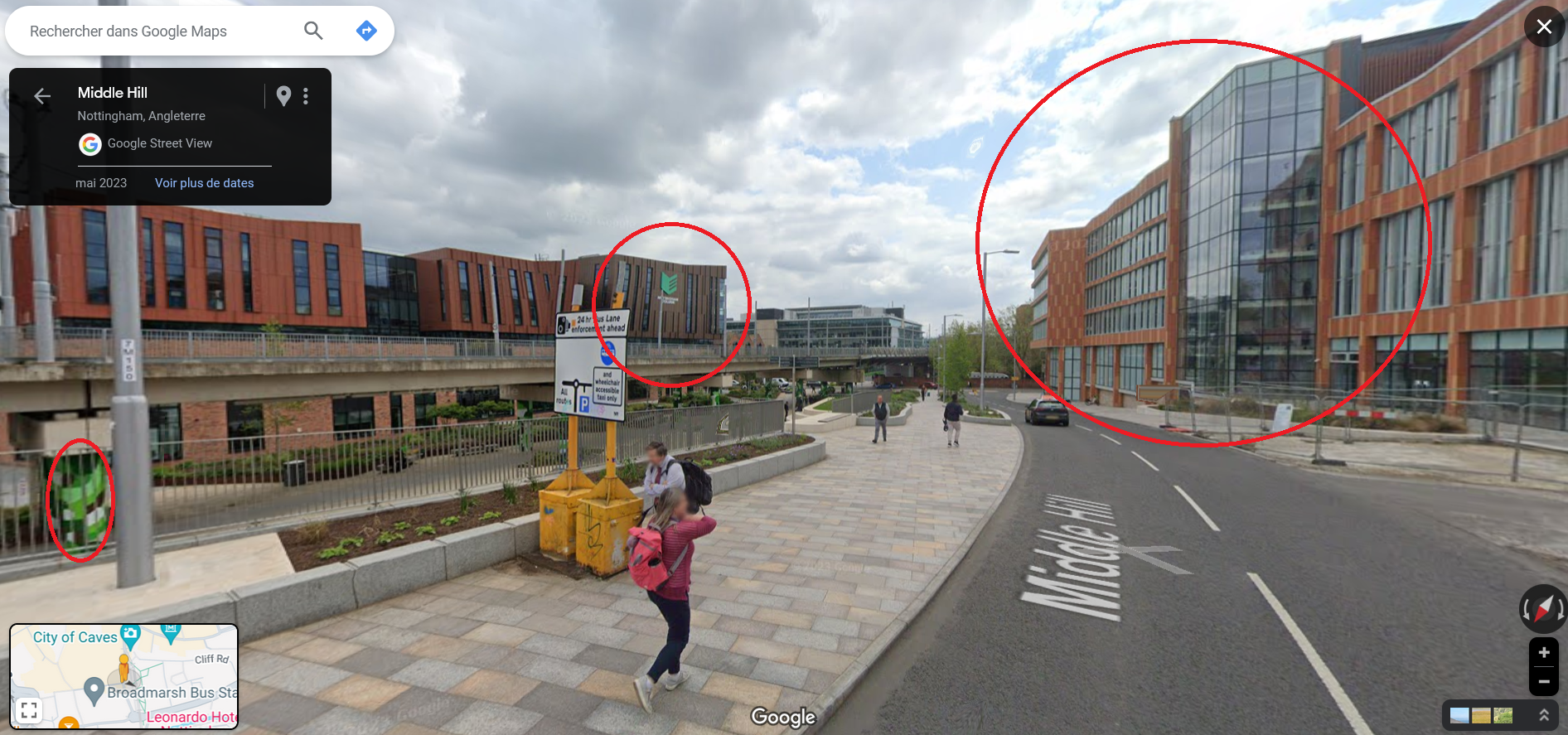 On trouve un résultat dans la ville de Nottingham, apparemment à proximité d'un "spot" de skate, en dessous d'une ligne de train/tram et non loin d'un "City of Caves tour". On s'y rend sur Google Maps et on localise les différents éléments de la photo pour se rapprocher de l'endroit de la prise de vue.