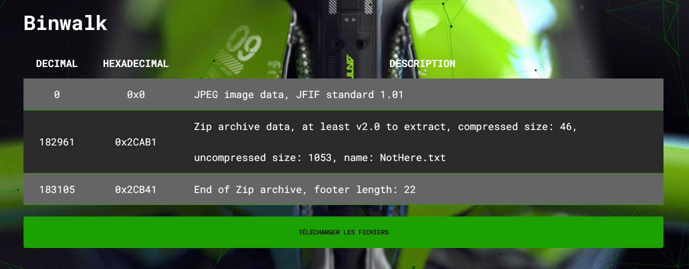 Parmis les résultats, le "Binwalk" attire l'oeil car il contient une archive ZIP avec un fichier nommé "NotHere.txt", qui se trouve être la piste probable à la résolution de ce challenge.