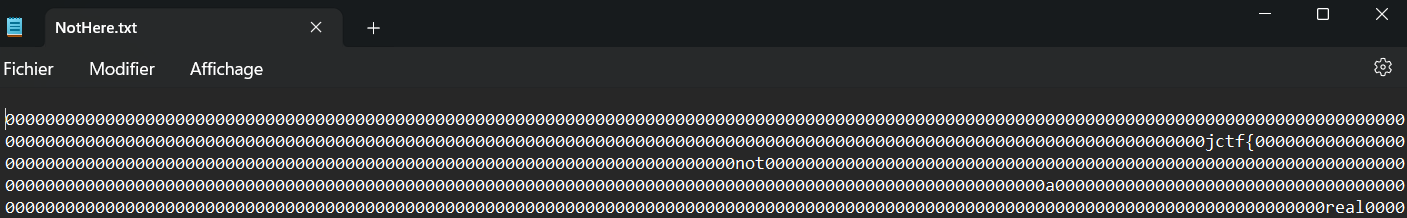 On ouvre le fichier texte et on se retrouve avec une étrange chaîne de caractère qui contient les mots du flag espacés par des 0.